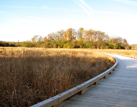 Three miles of trails for hiking, bicycling and cross-country skiing take visitors through open areas of gently rolling hills that feature views of the marsh and scattered groves. Please keep dogs leashed and on trails at all times, and pick up after them. Learn about our Off-Leash Dog Areas (permit required).