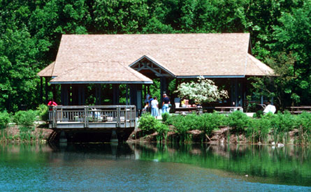 This unique shelter at Half Day Forest Preserve in Vernon Hills overhangs a picturesque pond, providing a scenic backdrop for weddings and other special celebrations and events.