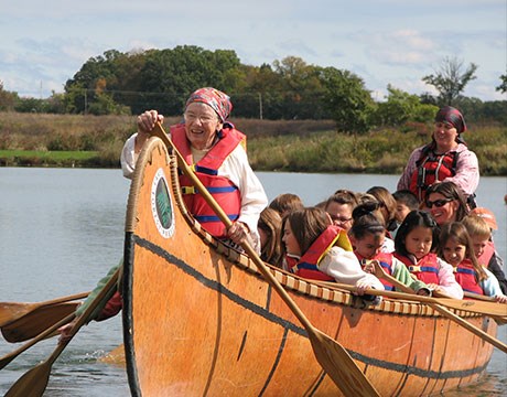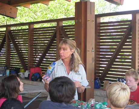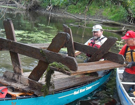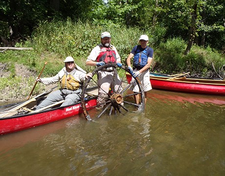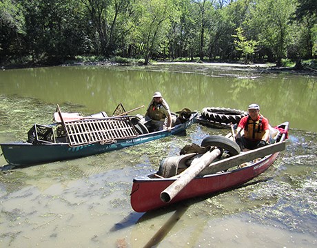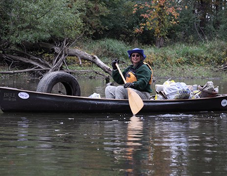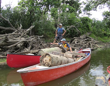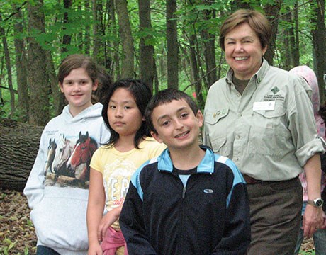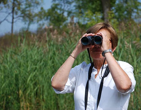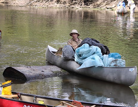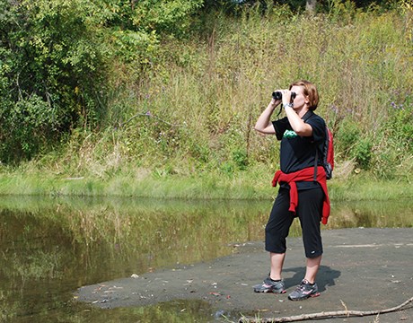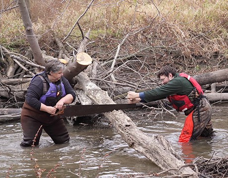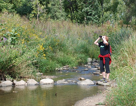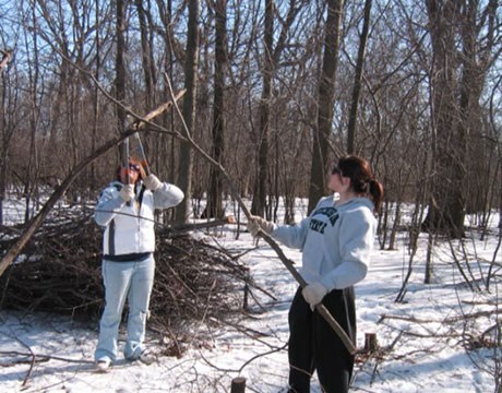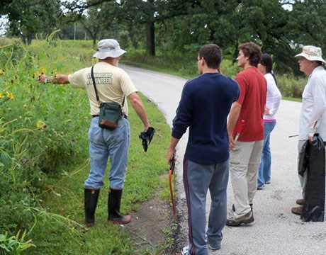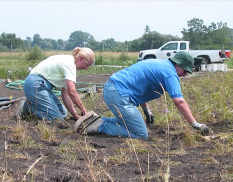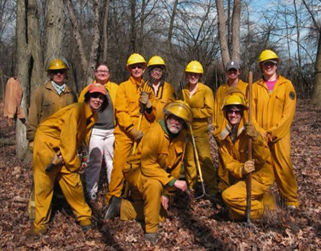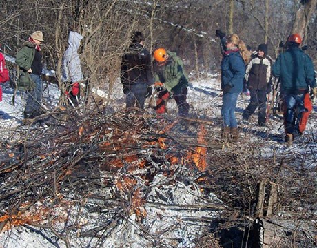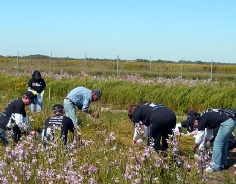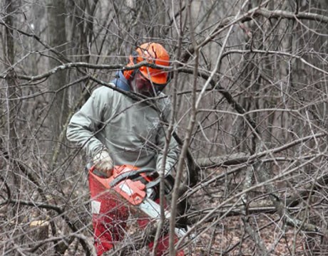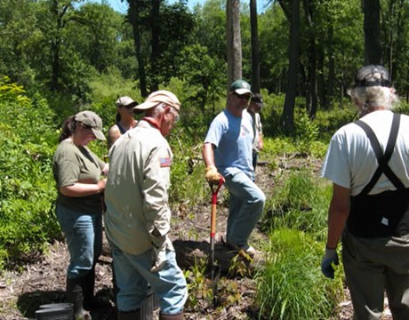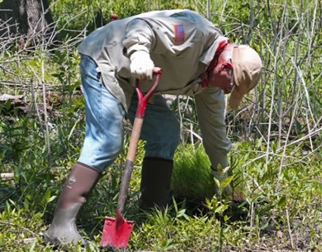 • Volunteer worker bent over pulling invasive weeds in the forest preserve